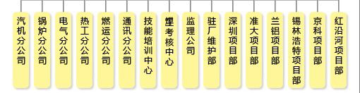 公司下设七个职能管理部门、七个专业分公司及技能培训中心和焊工考核中心。其中,技能培训中心和焊训中心分别是经国家劳动和社会保障部批准的特有工种职业技能鉴定站,即“中电投第二火力发电国家职业技能鉴定站”,和国家及电力行业双重认定的一级焊工考核中心。近年来,监理公司和技能培训中心的业务范围不断拓展,使公司逐步实现了由劳务输出向技术和管理输出的转变。另外,公司下设8个项目部(清河、深圳、红沿河、锡林、京科、营口、九台,福州)。