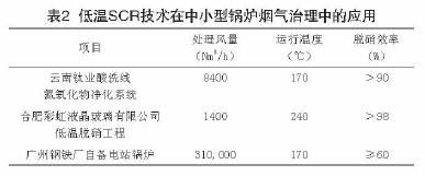 低温SCR催化脱硝技术的应用是一项非常复杂的工程,面临着众多应用领域。表2列举了我国低温SCR技术在酸洗行业、玻璃窑炉和钢铁锅炉烟气治理中的应用。