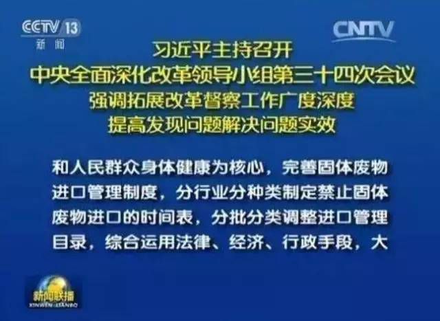 会议指出,要以维护国家生态环境安全和人民群众身体健康为核心,完善固体废物进口管理制度,分行业分种类制定禁止固体废物进口的时间表,分批分类调整进口管理目录,综合运用法律、经济、行政手段,大幅减少进口种类和数量。要加强固体废物回收利用管理,发展循环经济。