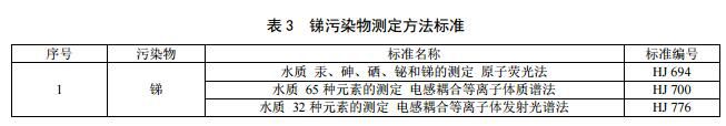 5.3地方环境监测机构对废水的监督性监测和企业自行监测,其采样频次和采样方法参照HJ/T91《地表水和污水监测技术规范》中污染源污水监测的采样规定执行。对企业排放废水中锑污染物浓度的测定方法见表3。