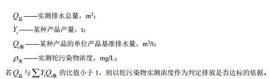 4.5锑污染物排放浓度限值适用于单位产品实际排水量不高于单位产品基准排水量的情况。若单位产品实际排水量超过单位产品基准排水量,须按公式(1)将实测锑污染物浓度换算为锑污染物基准水量排放浓度,并以锑污染物基准排水量排放浓度作为判定排放是否达标的依据。产品产量和排水量的统计周期为一个工作日。在企业的生产设施为两种及以上工序或同时生产两种及以上产品,且生产设施产生的污水混合处理排放的情况下,应执行本标准中规定的两种及以上产品的基准排水量总和,并按公式(1)换算废水中锑污染物基准排水量排放浓度。