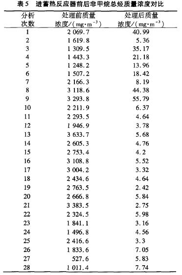 2016年6-7月取样分析,经蓄热反应器处理前后非甲烷总烃质量浓度对比见表5。